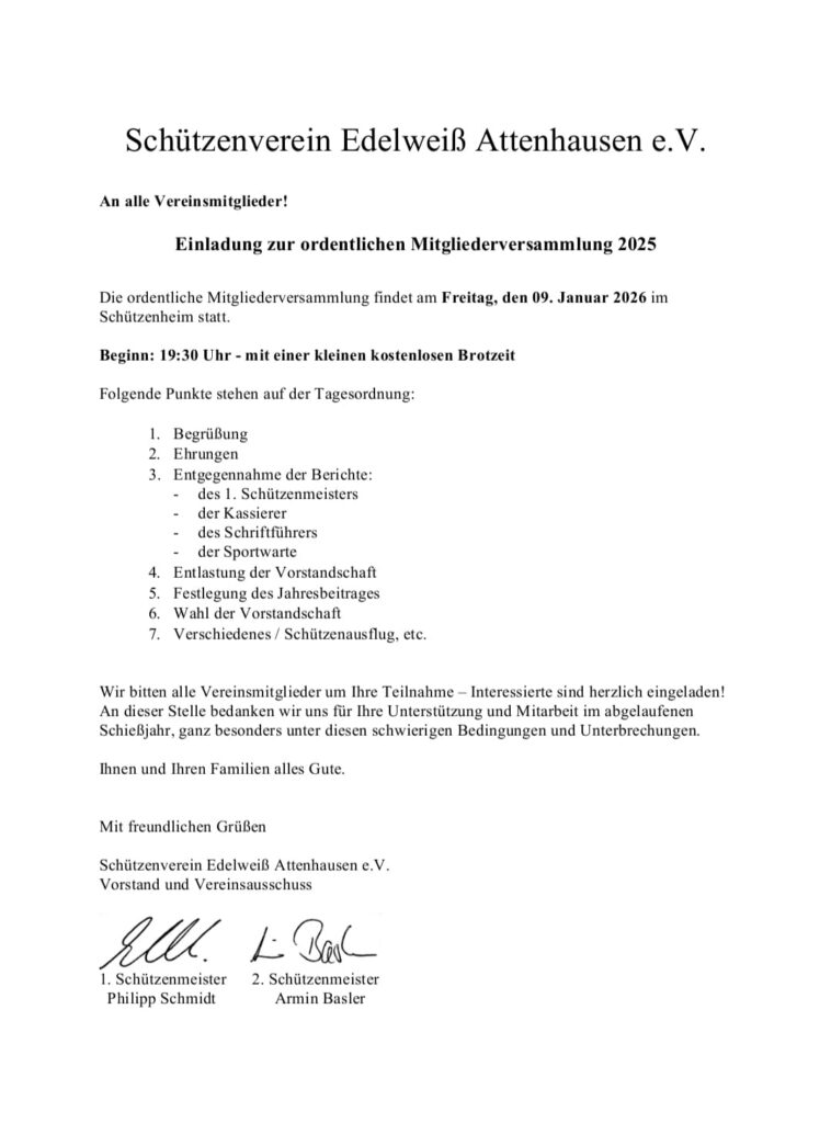 Einladung zur ordentlichen Mitgliederversammlung am 09.01.2026 Posted on 30. Dezember 2025 by Michael Schön